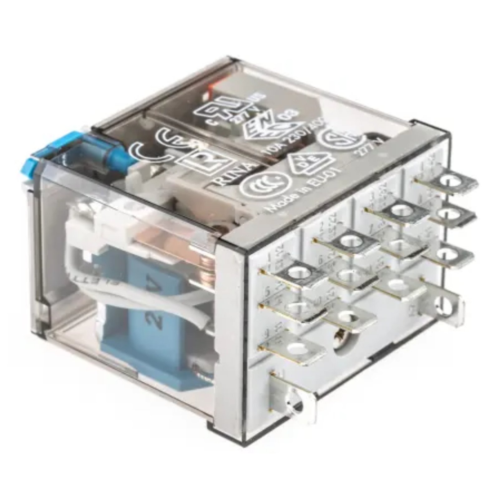 Relej: industrijski plug-in relej, 4PDT (4xNO/NC kontakta), monostabilan, s mehaničkim indikatorom i test-dugmetom – četverostruki kontakti
